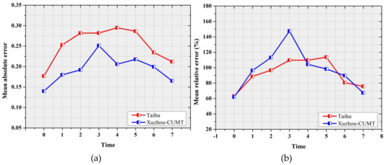 The AOD retrieved by satellite was compared with the observation data of Taihu and Xuzhou-CUMT stations, and the MAE and MRE of GOCI AOD at Taihu and Xuzhou-CUMT were calculated respectively (Figure 8). It can be seen that the AOD retrieved at noon has a larger error, the mean absolute error and mean relative error of the morning and afternoon are small, and the AOD retrieved in the morning is more accurate.