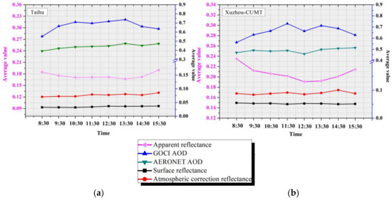 To analyze the reasons for the different AOD errors retrieved under GOCI’s 8 solar angles, the GOCI surface reflectance, apparent reflectance, and the average values of GOCI AOD and AERONET AOD at Taihu and Xuzhou-CUMT stations were calculated. Using the average of the apparent reflectance and AERONET AOD, and atmospheric correction reflectance is obtained by 6S (Figure 9). It can be seen that the GOCI surface reflectance value determined in Section 2.4.2 is lower than the surface reflectance value obtained by atmospheric correction, which makes the AOD retrieved by remote sensing higher than the AERONET AOD. The deviation between the surface reflectance of GOCI in the morning and the surface reflectance value obtained by atmospheric correction is relatively small (Table 4). Therefore, the AOD retrieved in the morning is closer to the AERONET AOD. At 10:30 a.m., 11:30 a.m., 12:30 p.m. and 13:30 p.m., the retrieval errors are relatively large.