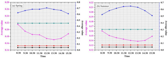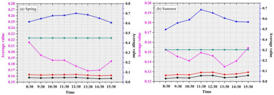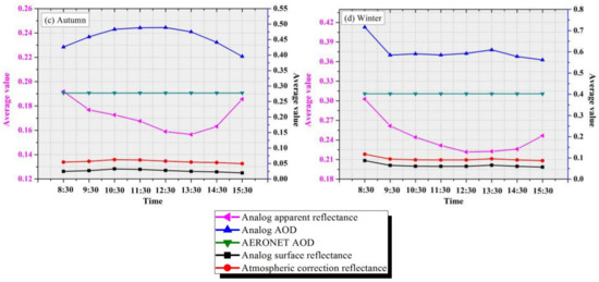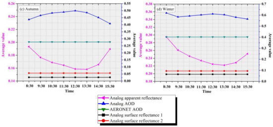 With the change of angle, the simulated AOD changes in spring, summer and autumn are higher at noon, and smaller in the morning and afternoon (Figure 11). The simulated AOD error in winter is the largest at 8:30 a.m., which may be caused by the residual cloud after GOCI cloud removal. Residual cloud is also one of the reasons for the high AOD retrieval value over land [42]. By comparing Figure 9 and Figure 10, it can be seen that the final simulated AOD change trend is the same. Therefore, the root cause of the difference between the GOCI AOD and AERONET AOD values retrieved at different times in the four seasons in Figure 11 is the inaccurate determination of the surface reflectance. In the case of the same surface reflectance deviation, the larger the solar angle (morning and afternoon), the closer it is to AERONET AOD.