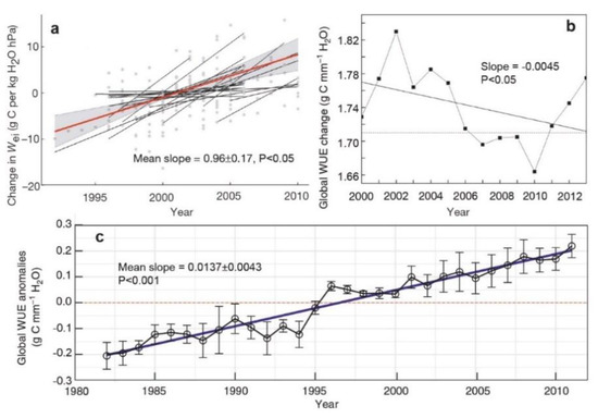 - Huang, M.; Piao, S.; Sun, Y.; Ciais, P.; Cheng, L.; Mao, J.; Poulter, B.; Shi, X.; Zeng, Z.; Wang, Y. Change in terrestrial ecosystem water-use efficiency over the last three decades. Glob. Chang. Biol. 2015, 21, 2366–2378. [Google Scholar] [CrossRef]