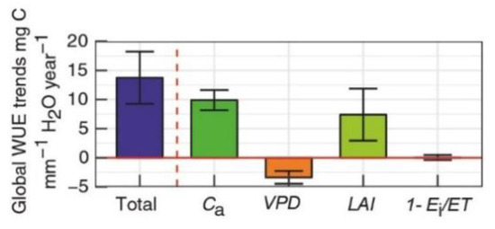 | Optical WUE | Controlling effect of VPD | GPP × VPDk*/ET | [1,6,24,25] |