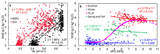 | US-Ne2 US-Ne3 | Cropland | WUE = 7.570 × EVI − 1.041 WUE = 5.565 × NDVI − 1.227 | R2 = 0.82 R2 = 0.75 | [95] |