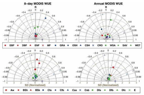 - Sun, Y.; Piao, S.; Huang, M.; Ciais, P.; Zeng, Z.; Cheng, L.; Li, X.; Zhang, X.; Mao, J.; Peng, S.; et al. Global patterns and climate drivers of water-use efficiency in terrestrial ecosystems deduced from satellite-based datasets and carbon cycle models. Glob. Ecol. Biogeogr. 2016, 25, 311–323. [Google Scholar] [CrossRef]