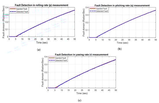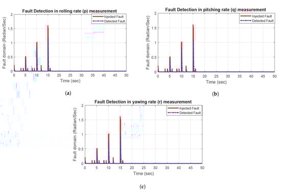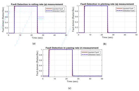 Abrupt fault detection. (a) Abrupt fault detection in rolling rate measurement. (b) Abrupt fault detection in pitching rate measurement. (c) Abrupt fault detection in yawing rate measurement.