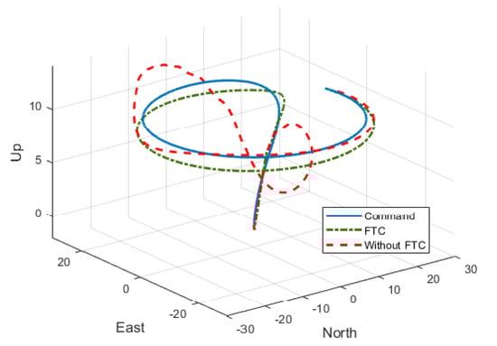 Three different faults explained in the previous subsection are injected into the rolling rate (p), pitching rate (q), and yawing rate (r) of the unmanned helicopter sensors. The simulation results shown in Figure 4, Figure 5 and Figure 6 demonstrate the proposed algorithm’s ability to detect a wide range of possible system faults. The obtained results prove that the algorithm is reliable enough to be applied for the proposed active FTC design and to guarantee an unmanned helicopter’s performance during hovering in the presence of faults. In order to prove the fault tolerance capability of the proposed FTC design, a circular trajectory, as shown in Figure 7, is implemented to the helicopter. The abrupt fault is injected into the rolling, pitching, and yawing rates for 20 seconds of the simulation, as shown in Figure 4. The result of the proposed FTC design is compared with a nonlinear dynamic inversion controller. As Figure 7 shows, the proposed controller is able to mitigate the injected fault and track the commanded trajectory with sufficient accuracy.