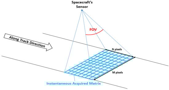 Push broom scanners are commonly used in large satellite optical observation systems. Examples of EO satellites using push broom sensors are SPOT, IKONOS, QuickBird, and TERRA [,,,]. This technology, also known as line imager, is based on a linear arrangement of detector elements covering the full swath width. The related read-out process delivers one line after another along the ground track, and each detector element corresponds to a pixel on-ground. In this case, the ground pixel size and the velocity of the sub-spacecraft point define the integration time []. The most recent technological developments in optical sensors, combined with power, mass and volume constraints typical of CubeSats, suggest using COTS imagers based on CMOS sensors, also known as step-and-stare scanners, based on a NxM (image rows x columns) arrangement of detector elements that can be used as a matrix imager to acquire pictures from orbiting spacecraft. Each detector element corresponds to a pixel on-ground. The ground pixel size and the sub-satellite-point velocity determine the integration time [].