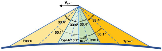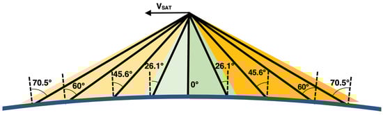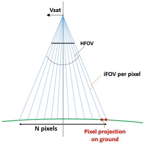 The information collected within each row of the sensor will be characterized by a different instantaneous field of view (iFOV) per pixel, as shown schematically in Figure 2, in which the Earth is considered as a sphere, and no scale is properly kept. This configuration ensures the required coverage, depending on the camera HFOV and the integrated number of cameras. With this implementation, observations can be obtained at as many off-nadir angles as the number N of pixel (“rows”) in the sensor array.
