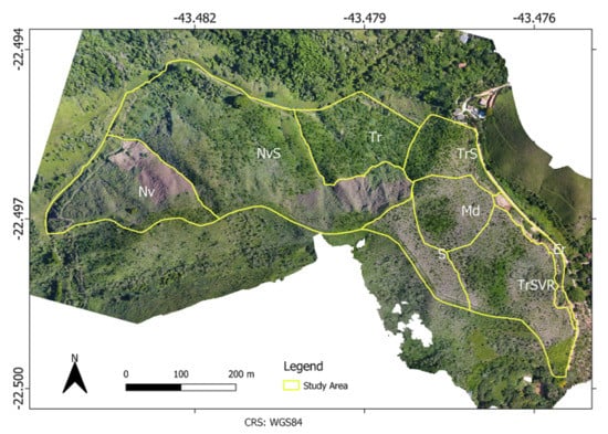 The FR study area is located in the Brazilian Atlantic Forest biome, specifically at the Miguel Pereira Municipality in the state of Rio de Janeiro (RJ). Figure 1 illustrates this 23.45 hectare study area, where Instituto Terra de Preservação Ambiental (ITPA) conducted an FR project.