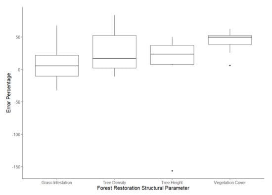 Tree Height is the only FR structural parameter in this study that cannot be evaluated by photointerpretation. Therefore, the accuracy of this parameter was measured using the Error Percentage [37] between the fieldwork and RPA results (Equation (8)).