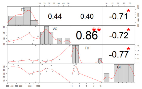FR structural parameters Correlation Matrix between different FR stretches. In this symmetric matrix, the cells of the main diagonal shows a FR structural parameter (TD is Tree Density, VC is Vegetation Cover, TH is Tree Height, and GI is Grass Infestation) and its corresponding values in the different FR stretches. The other cells show the correlation value between different FR structural parameters, where the more asterisk (“*”) symbol occurs, the more correlated two variables are.