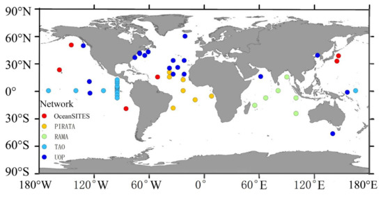 The , , and SST measurements were collected from 55 global moored buoy sites in 5 measuring networks (Table 1) and have been commonly used in previous studies [19,20]. Figure 1 shows the distribution of these buoy sites, which were mainly located within the sea areas between 50° S and 50° N. After strict quality control and a manual inspection, only the measurements with the highest quality were kept [21]. For measurements with sampling frequencies less than one day (i.e., the Ocean Sustained Inter-Disciplinary Time-Series Environment Observation System (OS) and Upper Ocean Processes Group (UOP) data), the daily mean , , and SST values were calculated by averaging all hourly observations as long as no missing data appeared in one day. Afterwards, the daily value was obtained according to Equations (1)–(3), and then the monthly value was calculated only when more than 60% of the daily samples in the corresponding month were available. Finally, totals of 56,460 daily and 1773 monthly in situ sea-surface samples were obtained and used for the accuracy validation.