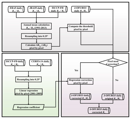 Three major steps were contained in this method. In Step 1, the thresholds were defined to determine the pixels with inconsistency issues. By considering the relatively stable performances and available time lengths, three products (ERA5, JRA5, and ISCCP-FH) were taken as the references. The differences between the average annual mean sea-surface (ΔRns) and (ΔRli) values before and after 2000 (the averages for 2000–2013, minus the averages for 1993–1999) for the three products were computed and then interpolated into a 0.25° grid, respectively; then the thresholds for each 0.25° pixel were defined as the sum of the median and the standard deviation of the ΔRns and ΔRli values of the three products. In Step 2, all the J-OFURO3 pixels that needed to be corrected were determined as long as their ΔRns or ΔRli values exceeded the corresponding thresholds. Then, in Step 3, because of the superiority of the performance in the CERES-3A radiation product both for land and sea surfaces, as indicated by previous studies [32,33], a set of regression models were built pixel by pixel by regressing the sea-surface or Rli value from the ISCCP-FD dataset to that from the CERES-3A dataset during their overlapping period from 2001 to 2009 to correct these inconsistent pixels, and then these models were applied on the and/or Rli value of these selected pixels from 1988 to 1999 by assuming that the relationships of the sea-surface or Rli values between ISCCP-FD and CERES-3A remained constant. The correction model is shown in Equation (4):
