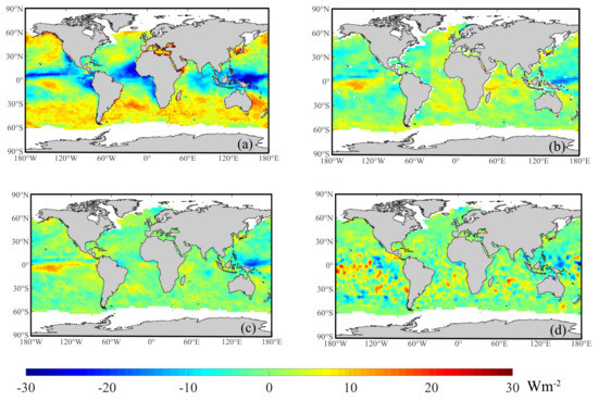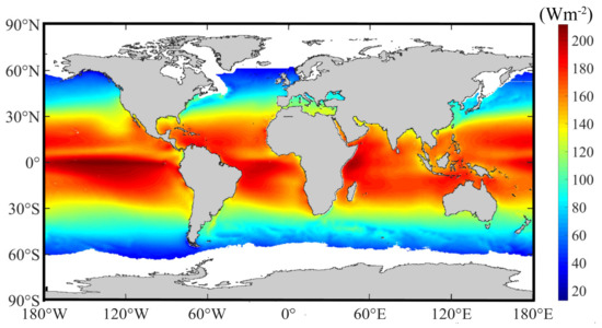 where is the daily sea-surface shortwave broadband albedo, is the daily sea-surface broadband emissivity, and is the Stefan–Boltzmann constant (5.67 × 10−8 W·m−2·K−4). The terms and were usually defined as constants in many previous studies without consideration of their variations [13,14]; therefore, the use of the dataset (2000–2013) from Feng [15] and the dataset (1988–2013) from Cheng [16], both of which have 0.05° spatial resolutions at the daily scale used in this study, would be more reasonable than the use of data from other studies [17,18]. Note that the dataset starts in 2000; thus, the multiannual average daily values from 2000 to 2013 were used for the period before 2000 (1988 to 1999) by considering the relatively lower variations in the values of this parameter from year to year. The units for all radiative components are Wm−2, the time format is GMT, and the downward direction is positive in this study.