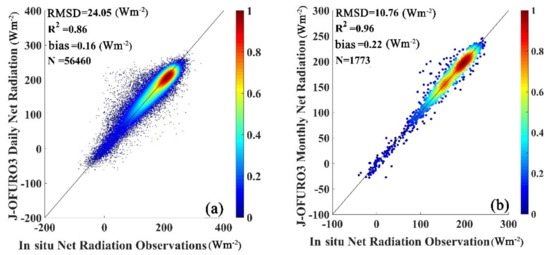 The scatter plots of the J-OFURO3 daily/monthly sea-surface data from 1988 to 2013 against the in situ sea-surface data are shown in Figure 4. The two plots show that the daily and monthly J-OFURO3 and in situ sea-surface values are symmetrically distributed around the 1:1 line, with overall R2 values of 0.86 and 0.96, RMSD values of 24.05 and 10.76 Wm−2, and biases of 0.16 and 0.22 Wm−2 for the daily and monthly scales, respectively, which were similar to the results obtained by Jiang et al. [35] with RMSD of 24.712 Wm−2.