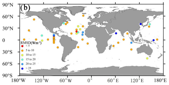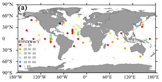 Figure 5 presents the spatial distribution of the J-OFURO3 sea-surface uncertainties at each individual site presented with the RMSD values. The increased RMSD values from the sites in open-sea areas to those in coastal areas at both the daily and monthly scales indicate that the performance of the J-OFURO3 sea-surface gradually worsened; it was speculated that the worse accuracy of this dataset in coastal areas than in open-sea areas was possibly caused by pixels being extrapolated from nearby pixels, even though no satellite observations were available [12]; further quality checks should be performed in coastal areas, as pointed out by Tomita [5].