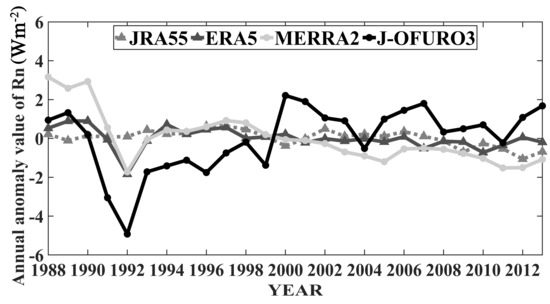 Finally, the annual trends observed in the sea-surface Rn data from 1988 to 2013 were calculated by using the corrected J-OFURO3 sea-surface Rn values with a linear regression model [34], and the results were compared to those calculated from ERA5.