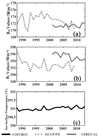 To determine the reason for this discrepancy, the consistency of each radiative component in the J-OFURO3 dataset was further examined. As mentioned above, the major radiative components ( and ) in the J-OFURO3 dataset were interpolated from the ISCCP-FD (before 2000) and CERES-3A datasets; hence, the average annual mean sea-surface and values over the global ice-free oceans obtained from the two data sources (ISCCP-FD from 1988–2009 and CERES-3A from 2001–2013) were examined, and then, the SST values from J-OFURO3 during 1988–2013 were also examined, as they determined the values. All results are shown in Figure 7. Obvious discrepancies were seen between ISCCP-FD and CERES-3A during their overlapping period (2000–2009) in both the sea-surface (Figure 8a) and (Figure 8b) values, especially for , while the relatively stable variations observed in the SST data (Figure 8c) indicated that the sharp increase in the J-OFURO3 sea-surface values during 1999/2000 was most likely caused by the changes in the input data sources of and in approximately 2000.