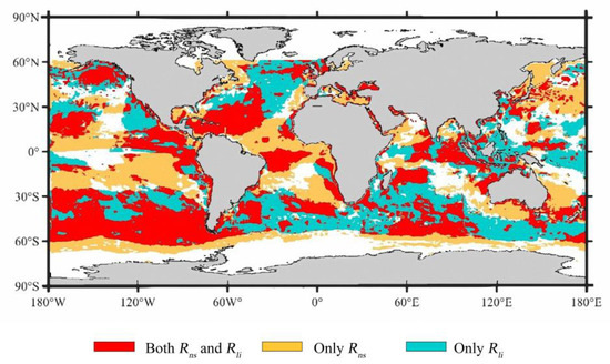 As described in Section 2.2, the pixels with the inconsistency observed in the J-OFURO3 sea-surface time series in approximately 2000 were determined and then were addressed by correcting their and values from the ISCCP-FD product before 2000 (1988–1999) to those from the CERES-3A product according to Equation (4). Figure 9 presents all pixels that needed to be corrected in J-OFURO3.