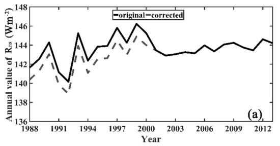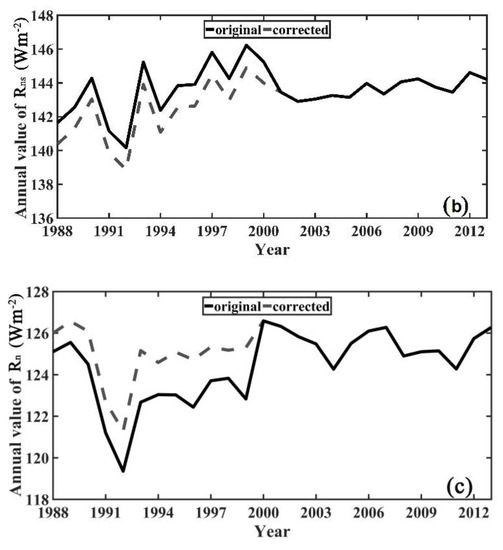 Figure 10a,b shows the interannual variations in the annual mean sea-surface or Rli over the global ice-free oceans before and after the inconsistency correction. Compared to the original values, the values of the corrected sea-surface and Rli and, thereby, the corrected values before 2000 (the black line in Figure 10) were more consistent with the values after 2000 but without much change in their variation trends; specifically, the sharp increase in approximately 2000 caused by the changes in the input datasets was eliminated in the corrected time series. After correction and comparison with the original dataset, it was found that the inconsistency issues in the J-OFURO3 sea-surface Rn were caused by different radiative component at different regions (Figure 11). Overall speaking, the inconsistency in Rn over the seas within the tropical region (20° N–20° S) was mainly caused by the inconsistent Rns (Figure 11a); while the inconsistency in Rli lead to the inconsistent Rn over the seas for other regions (Figure 11b,c). Moreover, it shows that the corrected results before 2000 for all regions consistent with the sea-surface Rn values after 2000 very well with little changes in their variations.