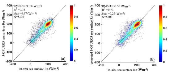 The direct validation results in Figure 12 indicated that the uncertainties in the J-OFURO3 sea-surface Rn during 1988–2000 decreased significantly by reducing RMSD from 39.03 to 38.59 Wm−2 and bias from 4.67 to 0.27 Wm−2 respectively after correction. Taking one moored buoy site UOP-SUB-SE (18.0° N, 22.0° W) as an example, Figure 13 shows that the variations in the monthly sea-surface time series from the corrected J-OFURO3 in 1992 were closer to the in situ than the original J-OFURO3. Therefore, the inconsistency correction method was so effective that the corrected J-OFURO3 sea-surface Rn values performed more reasonably.