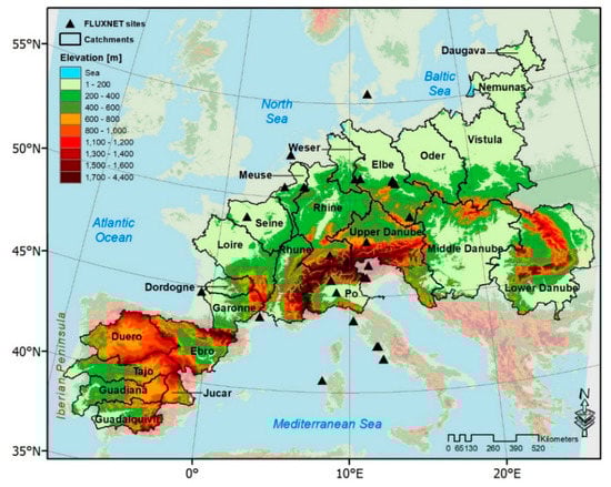 With the eventual goal of evaluating the suitability of RS-based ET estimates for the spatial pattern evaluation of basin-scale hydrological models, the data and methods have been selected accordingly. We focus on long-term moderate-resolution spatial patterns, not on biases or temporal dynamics. The temporal dynamics of RS-ET can also hold valuable information for constraining hydrological models [], but initially we seek to investigate the consistency of their long-term spatial patterns. We deliberately avoid comparing the RS-ET estimates to point measurements from eddy covariance (EC) towers, since these are very rarely compatible to the spatial scale of the RS estimate and are mostly suitable for assessing the temporal dynamics. However, we do employ EC data from 30 sites to derive an all-weather correction factor for RS estimates that are limited to clear-sky conditions. Consequently, our benchmarks are alternative methods to estimate large-scale ET patterns, namely, the WB-ET and Budyko approaches. These methods are mostly suited to estimate long-term averages and are, therefore, highly relevant to our analysis. In addition, the comparison to benchmark estimates targets large European river basins and their internal spatial patterns of ET. The selected river basins are the 23 largest river basins across Europe with drainage areas above 20,000 km2 and located below 60°N (Figure 1). The intercomparison of remote-sensing-based ET estimates at a 1 km resolution is conducted on the entire land phase of the domain in Figure 1. Based on the data availability, the aggregation period for the study area is 2002–2014.
