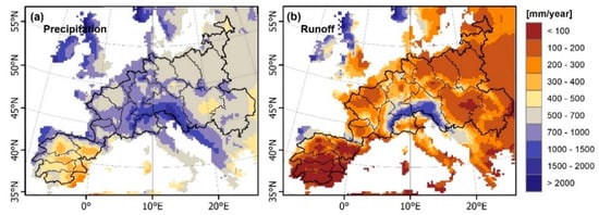 For the current study, both the E-Run and E-Obs data are aggregated to long-term annual averages for the period 2002–2014 and subset to the coverage in Figure 2 at a 25 km resolution (E-Run was resampled using bilinear interpolation). The resulting long-term precipitation and runoff maps are illustrated in Figure 2.