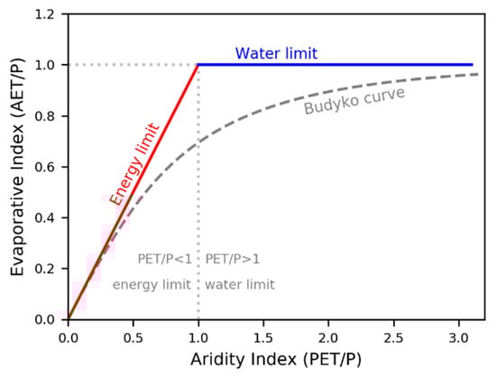 The Budyko curve representing the energy-limit (ET = PET) and the water-limit (ET = P) lines.