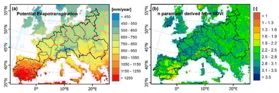 The Budyko ET approach components at a 25 km spatial resolution: (a) potential evapotranspiration and (b) distributed n parameter values derived from NDVI, both for the period of 2002–2012.