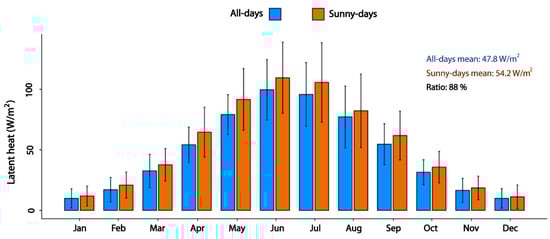 The long-term monthly mean (2002–2014) latent heat flux (LE) during all days and sunny days for 30 FLUXNET stations across Europe. See Figure 1 for the spatial distribution of the EC sites.