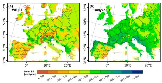 The spatial distributions of long-term annual mean evapotranspiration estimated from the water-balance approach (WB-ET) and the empirically based Budyko approach (Budyko ET) are illustrated in Figure 6a,b, respectively. The two estimates of ET vary considerably, both regarding magnitude and spatial pattern, despite utilizing the same precipitation data. The Budyko ET (Figure 6b) displays a spatial pattern with higher ET values in Central Europe, lower values in Eastern Europe and sharp gradients on the Iberian Peninsula. The WB-ET (Figure 6a) displays generally lower ET in Central Europe, very low ET in the Alps, Scotland and South of Norway and less gradients in the Iberian Peninsula. The Budyko approach represents a smoother and more seamless ET spatial pattern (Figure 6b) compared to WB-ET (Figure 6a), and seems to follow more closely the expected climatological patterns across Europe.