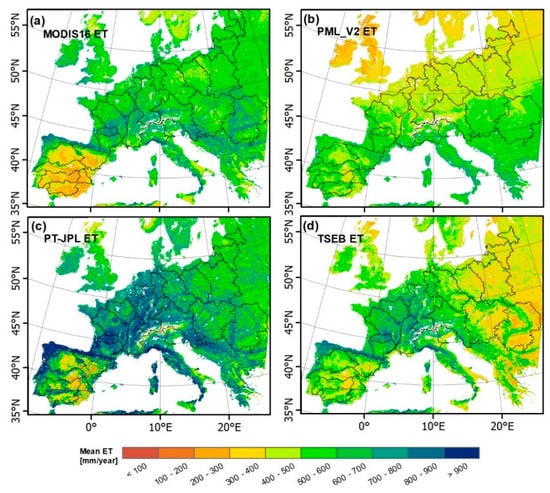 Satellite remote-sensing approaches are suitable to provide spatially distributed ET information. However, ET cannot be measured directly from space, but several algorithms are available to estimate ET by means of remotely sensed techniques []. Four remote-sensing ET estimates are considered in this study all based on data from the Moderate-Resolution Imaging Spectroradiometer (MODIS). With a spatial resolution of approx. 1 km, such ET estimates can provide information on a relevant scale for Europe, which is suitable for the calibration and evaluation of distributed process-based hydrological and land-surface models with a focus on spatial patterns of ET. Therefore, remote-sensing-based ET models such as GLEAM [] or the Meteosat-based LSA SAF ET [] were not considered in this study as they do not provide the desired resolution to assess spatial patterns within catchments. In addition, given the focus on observed spatial patterns of ET, the analysis of RS-ET is confined to approaches that are derived directly from satellite observations without use of a water budget model. All RS-ET datasets were resampled to 1 km grid cells, and first aggregated to monthly climatologies and then to annual timescales over the period 2002–2014 (see Figure 1). Missing data in the monthly climatologies, which are exclusively found in the winter months, were gap filled using the minimum value for the given cell before calculating the annual mean. The four remote-sensing ET algorithms used in this study are briefly described below, and further detailed characteristics of the RS-ET products are given in Table 1. Two of the estimates, the vegetation-based MODIS 16 and PML_V2 are readily available globally and easy to access. The two other estimates, PT-JPLthermal and TSEB, are in addition to vegetation, based on daily land surface temperature data, which are not readily available for download. PT-JPLthermal and TSEB require extensive preprocessing, especially on the European scale, since daily cloud masking and corrections for acquisition time is necessary. Moreover, the thermal-based ET methods are limited to clear sky conditions and need to be adjusted before comparison to the other ET estimates, which reflect all weather conditions. This will be elaborated in Section 2.2.5.
