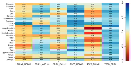 Subsequently, the RS-ET spatial patterns are compared on a river basin scale, by SPAEF calculated for the internal spatial patterns within the 23 selected basins, Figure 8. As for the continental scale comparison, PML_V2 displays the lowest similarity to the other RS-ET estimates. In many cases, PML_V2 indicates a strongly negative correlation when compared with other RS-ET maps. For example, a very different spatial pattern is identified between PML_V2 and TSEB (SPAEF: −1.0) in the Lower Danube basin (Figure 8). Among the three other estimates, TSEB vs. PT-JPL has the highest similarity (average SPAEF 0.38) followed by TSEB vs. MODIS16 (average SPAEF 0.34). This indicates that although TSEB and MODIS16 showed some differences in the cross-continental comparison due to systematic regional differences, the within-basin patterns can be quite similar. In contrast, MODIS16 vs. PT-JPL, which had the highest similarity in the cross-continental comparison, has a somewhat lower pattern similarity within each river basin (average SPAEF 0.19). As shown in Figure 8, SPAEF between individual catchments in TSEB ET and PT-JPL ET range from minimum: 0.12 in Lower Danube and maximum: 0.64 in Loire (see Figure 1 for the location of the catchments). Likewise, the spatial efficiency also indicates high correlations for most of the catchments between MODIS16 and TSEB ET and a wider range with a maximum SPAEF value of 0.71 obtained in Ebro catchment and minimum at Weser with −0.10. With regard to MODIS16 and PT-JPL, the numbers of catchments with a high SPAEF are limited (Figure 8).