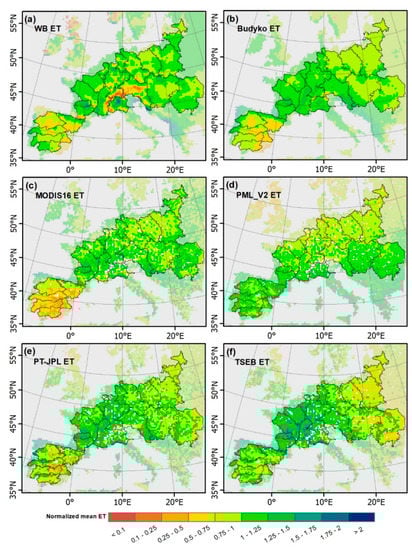 MODIS16, PT-JPL, TSEB and the Budyko estimates show common patterns and are all considered valid estimates of spatial patterns in ET on the European scale. Similarly, MODIS16, TSEB and PT-JPL are regarded as suitable datasets for evaluating internal spatial patterns at the river basin level for hydrological model evaluation.