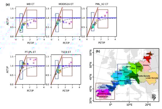 (a) Evaluation of the long-term (2002–2014) estimated WB-ET and derived RS-ET products using the Budyko curve; (b) geographical location of the catchments corresponding to the color of points in panels a. The red (blue) box represents catchments with the highest (lowest) aridity index, which fall in the water-limited (energy-limited) environment.
