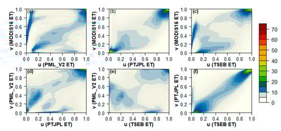 The empirical Copula densities (1 km grid at full-domain) amongst the satellite RS-ET products. (a–c) MODIS16 vs. other RS-ET estimates (d,e) PML_V2 vs. other RS-ET estimates, and (f) PTJPL vs. TSEB. The sample size is 2,247,522 data tuples for the ET datasets.