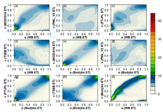 The empirical Copula densities (25 km grid at catchment-scale): (a–d) WB-ET and (e–h) Budyko ET against RS-ET datasets, and (i) WB-ET against Budyko ET. The sample size is 3413 data tuples for the ET datasets.