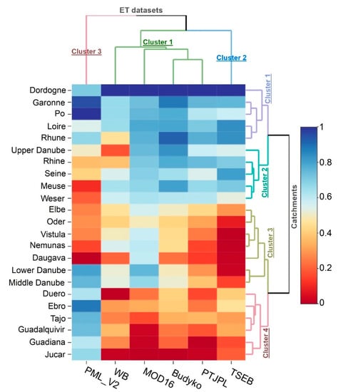 The six ET products and the selected 23 catchments used herein are classified into three and four main clusters, respectively, based on the ET-cluster (x-axis) and the basin-cluster (y-axis), as shown in Figure 13. The first ET-cluster is formed by the four estimates of PT-JPL and Budyko as well as MODIS16 and WB-ET; the second and the third ET-clusters are represented by TSEB and PML_V2, respectively. Within the first ET-cluster, PT-JPL and Budyko show the highest level of similarity, which is in good agreement with the Copula results (See also Figure 12g) and ET spatial patterns (see Figure 9b,e). TSEB and PML_V2 form individual “clusters”, with TSEB being more similar to cluster 1 than PML_V2. In terms of the basin-cluster, catchments located in the south-west central parts of Europe formed the first basin-cluster, where the highest ET values are found (e.g., Dordogne, Garonne and Loire); the second basin-cluster formed with catchments located in the north-central parts, which have the middle ranges of ET values (e.g., Weser, Meuse, and Rhine); the third basin-cluster formed with catchments located in Eastern Europe, where the middle to lower ranges of ET values are found (e.g., Lower Danube, Vistula and Daugava), and finally, the fourth basin-cluster formed with catchments located in the Iberian Peninsula, where the lowest ET values (except for the PML_V2 ET) are observed (e.g., Jucar, Guadalquivir, Tajo). See Figure 1 for the locations of the catchments. It is worth mentioning that these basin-clusters from 1 to 4 (Figure 13) are in very good agreement with the Budyko findings (see Figure 10), in which catchments with the lowest (highest) aridity index fall in the energy-limited (water-limited) environment, respectively.