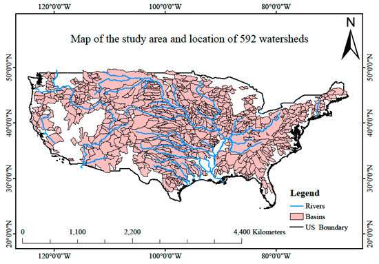 We chose the CONUS as the case study area, targeting 592 watersheds (Figure 1) distributed in 12 regions, comprising the Arkansas–Red Basin, California–Nevada, Colorado Basin, Lower Mississippi, Middle Atlantic, Missouri Basin, North Central, Northeast, Northwest, Ohio, Southeast, and West Gulf. The spatial resolution of the study area was set to 0.125°.