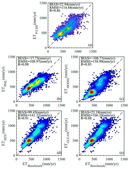 We first compared yearly P-LSH, PML, MODIS, MTE, and GLEAM data with yearly Recon data. All the R-values were equal to or higher than 0.85 (Figure 2). MTE had the largest R-value (0.91), followed by PML (0.88), GLEAM (0.88), P-LSH (0.86), and MODIS (0.85). Furthermore, the RMSE values of the five remote sensing ET datasets fell between 106 mm/year and 159 mm/year (Figure 2). MODIS had the largest RMSE value of 158.90 mm/year, while GLEAM had the lowest RMSE value of 106.10 mm/year (Figure 2c,e). PML (108.97 mm/year), P-LSH (114.44 mm/year) and MTE (141.32 mm/year) demonstrated an intermediate performance in terms of RMSE (Figure 2a,b,d). Furthermore, the RMSE values of PML, GLEAM and P-LSH were close (Figure 2 a,b,e), whereas the RMSE value of MODIS was more than 44 mm/year higher than that of GLEAM, PML and P-LSH (Figure 2a–c,e). In addition, the bias values of the five remote sensing ET datasets ranged between 99.45 mm/year and −106.71 mm/year (Figure 2). MODIS presented the largest bias value of −106.71 mm/year, while PML had the smallest bias value of −17.73 mm/year (Figure 2b,c). The bias value for P-LSH was 22.94 mm/year, which was close to that of PML (Figure 2a,b). Future studies should aim to reduce the bias of the MODIS and MTE algorithms.