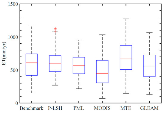Box plot of multiyear (2003–2008) average annual ET in this study.