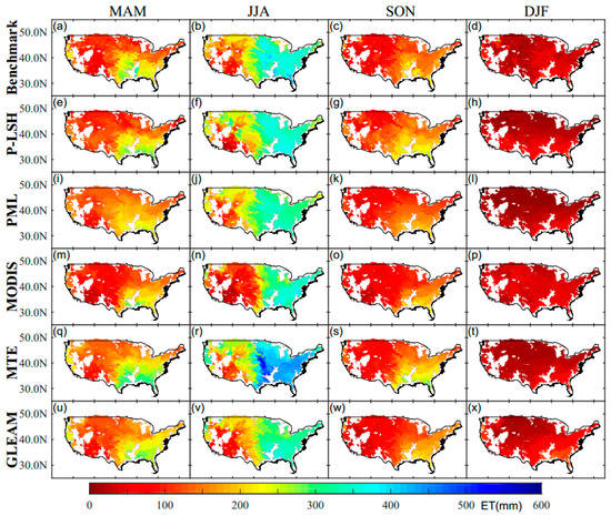 The spatial distributions of multiyear (2003–2008) mean seasonal ET for five datasets in CONUS: (a–d) spring (March, April, and May (MAM)), summer (June, July, and August (JJA)), autumn (Septemeber, October, and November (SON)), and winter (December, January, and Feburary (DJF)) average ET of Recon; (e–h) MAM, JJA, SON, and DJF average ET of P-LSH; (i–l) MAM, JJA, SON, and DJF average ET of PML; (m–p) MAM, JJA, SON, and DJF average ET of MODIS; (q–t) MAM, JJA, SON, and DJF average ET of MTE; and (u–x) MAM, JJA, SON, and DJF average ET of GLEAM.