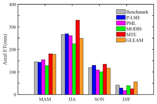 A spatial gradient for spring, summer, and autumn was clearly visible, whereas the spatial distribution for winter showed no spatial variability for the five ET datasets (Figure 5). According to the results of areal ET, P-LSH was most consistent with Recon data, followed by PML, MODIS, GLEAM, and MTE (Figure 6). This confirms that P-LSH performed better on a seasonal scale; however, the five remote sensing ET datasets performed poorly in winter, especially the GLEAM tends to overestimate in winter. This may have been due to the small ET, low temperature, and low vegetation in winter.