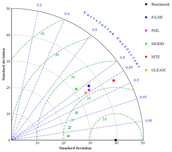 To further evaluate the five existing remote sensing ET datasets, we used a Taylor diagram at the monthly scale to compare their performance. The Taylor diagram measured the degree of correspondence between Recon and the five remote sensing ET datasets on the basis of three statistics: the correlation coefficient, the centered root-mean-square difference (RMSD), and the standard deviation, as shown in Figure 7. The monthly Recon data from the 592 watersheds from 2003 to 2008 (42,624 data points in total) were used as the reference. In terms of the correlation coefficient and RMSD, PML (pink point in Figure 7) and GLEAM (yellow point in Figure 7) were better than P-LSH (blue point in Figure 7), MTE (red point in Figure 7), and MODIS (green point in Figure 7). In terms of standard deviation, MODIS was closest to Recon, followed by GLEAM, PML, P-LSH, and MTE (Figure 7). However, MODIS had the lowest correlation coefficient (0.78) with Recon, whereas GLEAM was the closest (Figure 7).