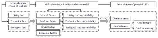 To identify the land use conflict types and levels, we developed a research framework (Figure 2). First, we constructed a reclassification system of land use based on the living–production–ecological functions. Second, we structured a multi-objective suitability evaluation model. Third, we obtained the distribution maps of living-production-ecological suitability. Finally, we identified the areas with potential land use conflicts and defined the specific conflict types and levels by overlaying the suitability maps.