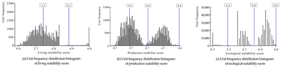 Unit frequency distribution histogram of Living-Production-Ecological suitability score. (a) Unit frequency distribution histogram of living suitability score; (b) Unit frequency distribution histogram of production suitability score; (c) Unit frequency distribution histogram of ecological suitability score.