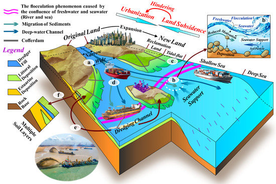 Worldwide, human civilization tends to be concentrated in coastal areas [1,2], resulting in increasing pressures on coastal living spaces. Hence, many coastal countries and regions [3,4,5,6] have reclaimed substantial land resources in recent decades, contributing considerably to the economic growth and urbanization process [7]. Shanghai, China, is located on a deltaic deposit near the estuary of the Yangtze River, which was developed in the interactive environment of the river and ocean. The sediments carried by the Yangtze River are deposited due to the combined effects of the widened river (Figure 1a), seawater support, and the flocculation phenomenon [8] (Figure 1b), contributing to the expansion of the coastal lands (Figure 1c). Nevertheless, the uplifted riverbeds of channels are not conducive for large vessels (Figure 1d). Therefore, dredging channel and hydraulic reclamation (Figure 1e) are the key measures to maintain the effective depth of water channels, to settle the dredged waste soil, to reap abundant reserve land resources, and to protect the marine and biological environments.