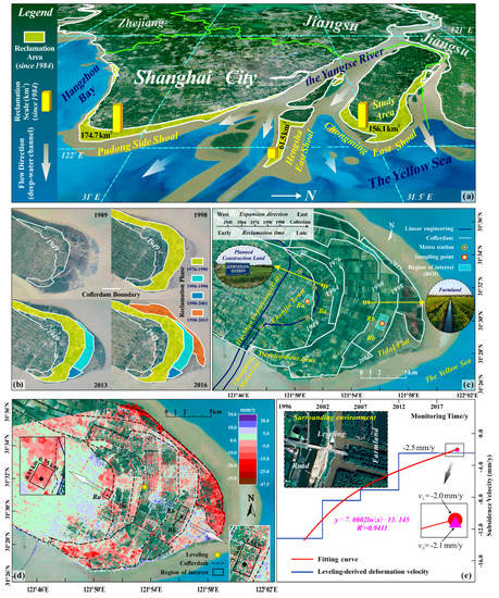 Google Earth-based overview of Chongming East Shoal (CES). (a) The main reclamation areas in Shanghai; (b) the advancement of multi-phase reclamation projects in CES since the 1990s; (c) site environment and land use; (d) SBAS-derived vertical deformation map from 22 March 2015 to 2 December 2019 (data from Reference [27]); (e) comparison of SBAS-derived deformation velocity (νS) and fitting leveling data (νL) at the leveling location (data from Reference [27]). (Note that the leveling measurement followed the specification of the second-order leveling with an error of 2 mm, based on the Chinese national height data from 1985).