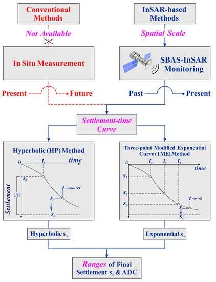 where the st is the settlement at a certain time t, and the s∞ is the potential ultimate settlement. Accordingly, the Ut is the ADC at time t. However, the s∞ is unknown and has to be reliably estimated. At present, there are roughly two types of soil settlement prediction methods: one is theoretical calculation method and numerical simulation method; the other is nonlinear method and curve fitting method. The former contains certain assumptions and simplified conditions, and the calculation process is dependent on extensive soil parameters; the latter is based on the measured deformation data, which not only has a certain theoretical basis but also can make full use of the field measured data, and the operation is relatively simple. Furthermore, compared with the nonlinear method, the curve fitting method is more intuitive, so it is easy to popularize in engineering. Within this framework, the HP method and exponential curve method, as typical curve fitting methods, have proved to be effective in deriving reasonable s∞ caused by various types of consolidation [47,48,49,50]. However, the traditional exponential curve model is relatively strict to the monotonicity of observed settlement data, presenting bad performance when the settlement magnitude is small and the monitoring curve is relatively fluctuated [51]. Therefore, the TME method was chosen. As shown in Figure 4, due to the limited in situ measurement, it is difficult to evaluate the soil consolidation characteristics at the spatial-scale, while the InSAR technique provides a new avenue to obtain the settlement-time curve from the past to the present. On this basis, the HY method and TME method can be applied. We here provide simplified theories of the two methods.