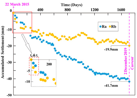 Time-continuous settlement curve in Ra and Rb during the monitoring period of 22 March 2015 to 2 December 2019.