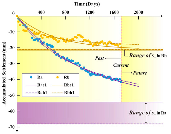 For Ra, both the HY method and TME method show an excellent fitting effect (R2 > 0.98); the average s∞ and ADC of the three prediction models that were established by the HY method are −68.4 mm and 60.9% in Ra, and they are −54.3 mm and 76.7% derived by TME method; Ra underwent a relatively rapid settlement during the monitoring period, the residual subsidence of which will continue over future years but with decreasing velocities.